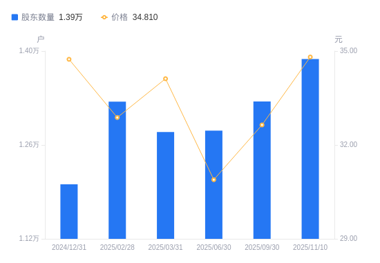 近一年(2024年12月31日至2025年11月10日),海尔生物A股股东户数从1.2万户,增加至1.39万户,增幅15.55%,区间股价上涨0.21%。