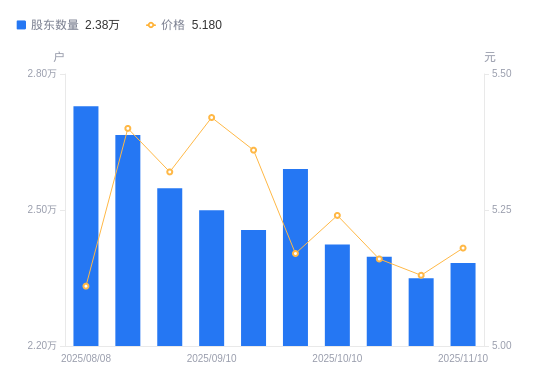 近一年(2024年11月29日至2025年11月10日),永利股份A股股东户数从2.45万户,减低至2.38万户,降幅2.82%,区间股价上涨10.10%。