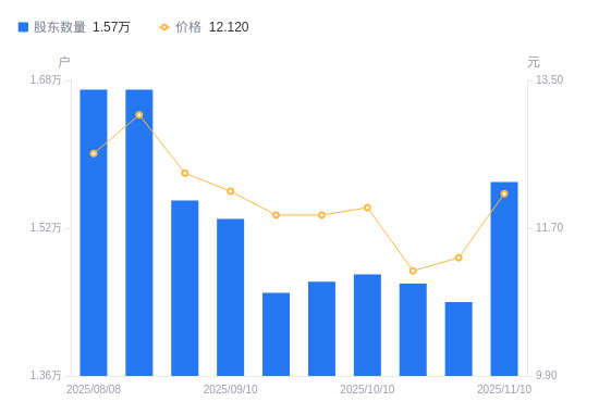近一年(2024年11月20日至2025年11月10日),晨化股份A股股东户数从1.61万户,减低至1.57万户,降幅2.48%,区间股价上涨20.95%。