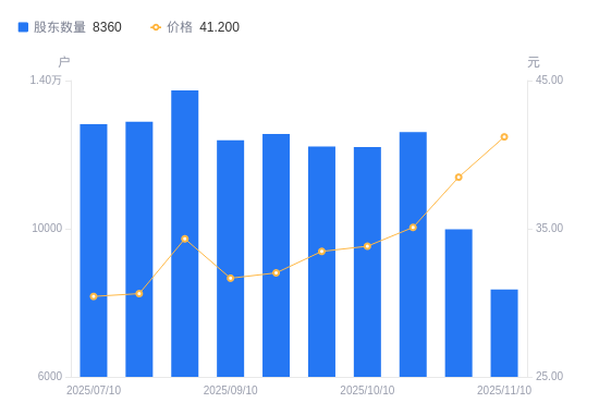 近一年(2024年12月10日至2025年11月10日),显盈科技A股股东户数从1.21万户,减低至8360户,降幅30.91%,区间股价上涨57.07%。