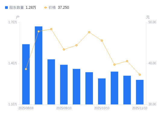 近一年(2024年11月20日至2025年11月10日),德迈仕A股股东户数从1.86万户,减低至1.28万户,降幅31.18%,区间股价上涨125.08%。