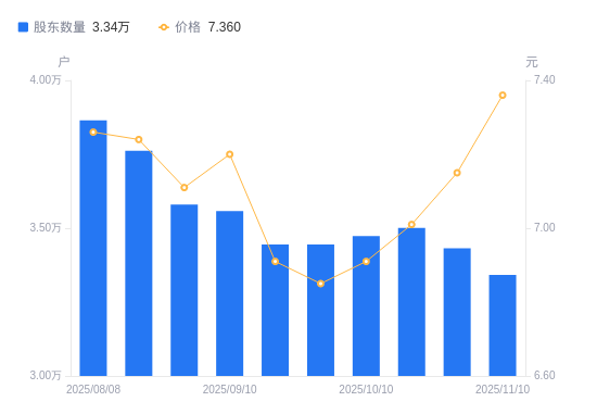 近一年(2024年11月10日至2025年11月10日),金陵药业A股股东户数从3.55万户,减低至3.34万户,降幅5.76%,区间股价上涨9.69%。