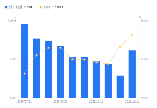 近一年(2024年12月31日至2025年11月10日),海川智能A股股东户数从8546户,增加至9738户,增幅13.95%,区间股价上涨53.52%。