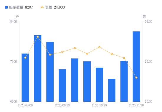 近一年(2024年12月31日至2025年11月10日),山科智能A股股东户数从8255户,减低至8207户,降幅0.58%,区间股价上涨36.34%。
