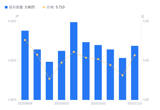 近一年(2024年12月31日至2025年11月10日),吉华集团A股股东户数从3.52万户,增加至3.9万户,增幅10.75%,区间股价上涨19.21%。