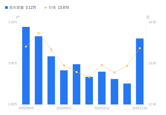 近一年(2024年11月20日至2025年11月10日),宁夏建材A股股东户数从2.94万户,增加至3.12万户,增幅6.14%,区间股价上涨3.20%。
