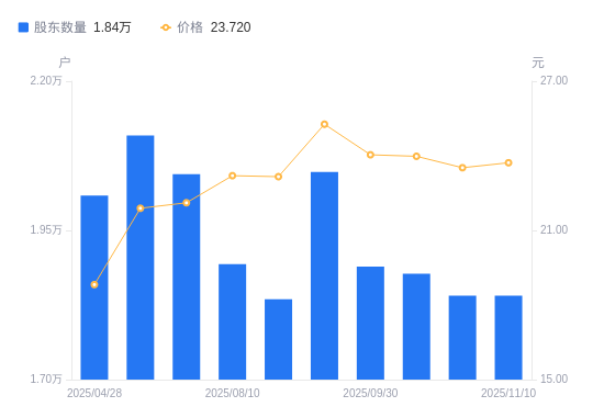 近一年(2024年12月31日至2025年11月10日),鼎龙科技A股股东户数从2.2万户,减低至1.84万户,降幅16.42%,区间股价上涨14.70%。