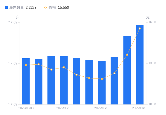 近一年(2024年11月20日至2025年11月10日),亨迪药业A股股东户数从1.79万户,增加至2.22万户,增幅23.92%,区间股价上涨12.06%。