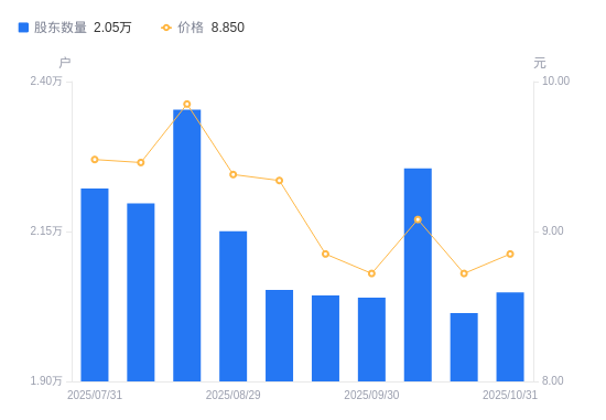 近一年(2024年11月8日至2025年10月31日),浔兴股份A股股东户数从1.45万户,增加至2.05万户,增幅40.90%,区间股价上涨6.50%。