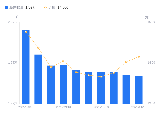 近一年(2024年11月20日至2025年11月10日),启迪设计A股股东户数从1.53万户,增加至1.59万户,增幅3.34%,区间股价上涨20.88%。