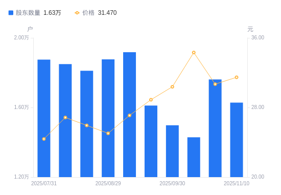 近一年(2024年11月20日至2025年11月10日),依依股份A股股东户数从1.53万户,增加至1.63万户,增幅6.16%,区间股价上涨107.13%。