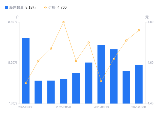 近一年(2024年12月31日至2025年10月31日),宝新能源A股股东户数从9.52万户,减低至8.18万户,降幅14.07%,区间股价上涨8.18%。