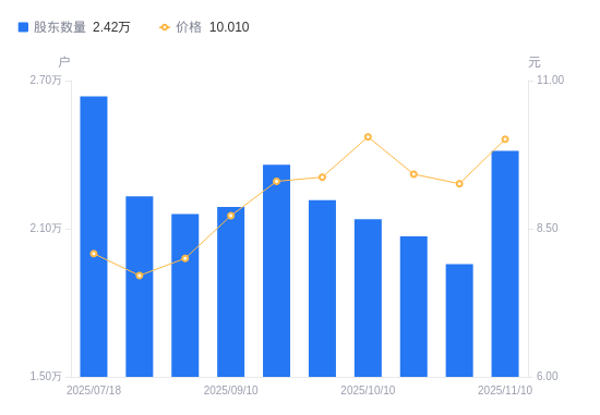 近一年(2024年12月20日至2025年11月10日),中新集团A股股东户数从2.15万户,增加至2.42万户,增幅12.17%,区间股价上涨28.96%。