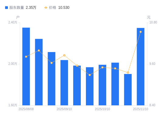 近一年(2024年11月20日至2025年11月10日),汇金通A股股东户数从1.63万户,增加至2.35万户,增幅43.65%,区间股价上涨28.68%。