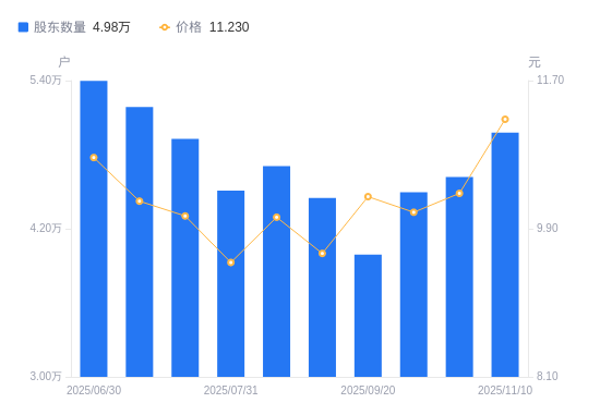 近一年(2024年11月20日至2025年11月10日),南京港A股股东户数从2.4万户,增加至4.98万户,增幅107.36%,区间股价上涨72.64%。