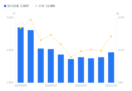 近一年(2024年11月20日至2025年11月10日),西部牧业A股股东户数从2.34万户,增加至2.36万户,增幅0.85%,区间股价上涨26.52%。