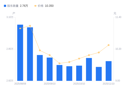 近一年(2024年11月20日至2025年11月10日),陇神戎发A股股东户数从2.88万户,减低至2.76万户,降幅4.32%,区间股价上涨12.62%。