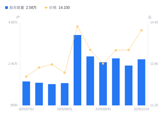 11月13日消息,数据显示,截至2025年10月20日,欧亚集团A股股东总户数为2.62万户,较上期(2025年9月30日)增加1502户,增幅6.09%。公司最新A股总股本为1.59亿股,其中流通A股1.55亿股,户均持有流通A股数量为5941.49股,较上期减少362.05股,降幅5.74%;户均持流通A股市值7.92万元,较上期减少1548.26元,降幅1.92%。
