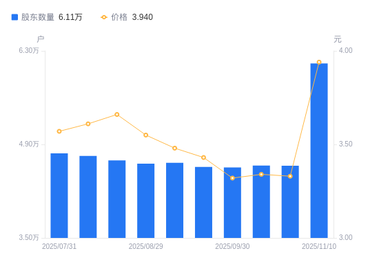 近一年(2024年11月20日至2025年11月10日),新能泰山A股股东户数从4.4万户,增加至6.11万户,增幅39.01%,区间股价上涨0.25%。