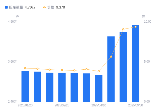 近一年(2024年9月20日至2025年9月19日),天沃科技A股股东户数从3.61万户,增加至4.5万户,增幅24.48%,区间股价上涨216.78%。