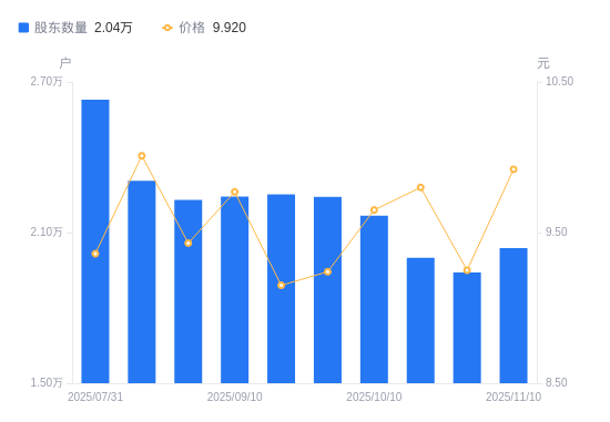 近一年(2024年11月20日至2025年11月10日),麦趣尔A股股东户数从2.46万户,减低至2.04万户,降幅17.18%,区间股价上涨24.78%。
