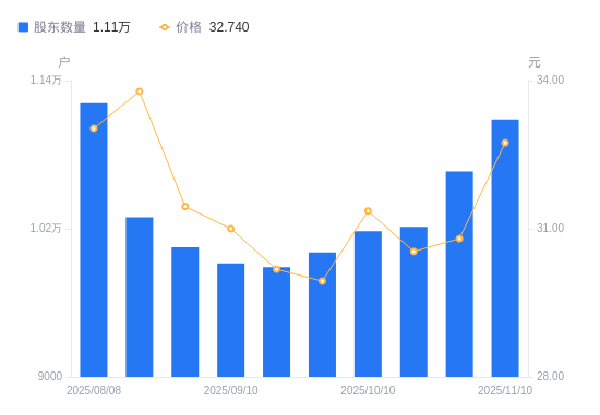 近一年(2024年11月20日至2025年11月10日),争光股份A股股东户数从1.22万户,减低至1.11万户,降幅9.07%,区间股价上涨32.92%。