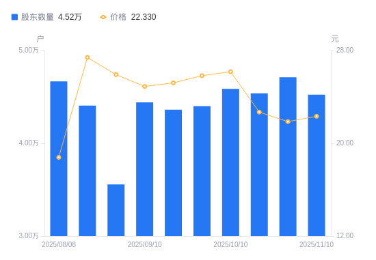 近一年(2024年11月20日至2025年11月10日),博威合金A股股东户数从3.64万户,增加至4.52万户,增幅24.42%,区间股价上涨19.10%。