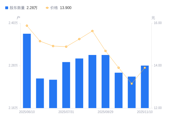 近一年(2024年12月10日至2025年11月10日),科思股份A股股东户数从2.34万户,减低至2.28万户,降幅2.56%,区间股价下跌26.51%。