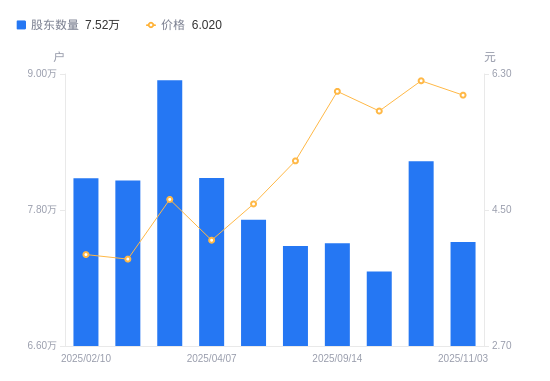 近一年(2024年11月20日至2025年11月3日),皖维高新A股股东户数从8.41万户,减低至7.52万户,降幅10.60%,区间股价上涨48.28%。