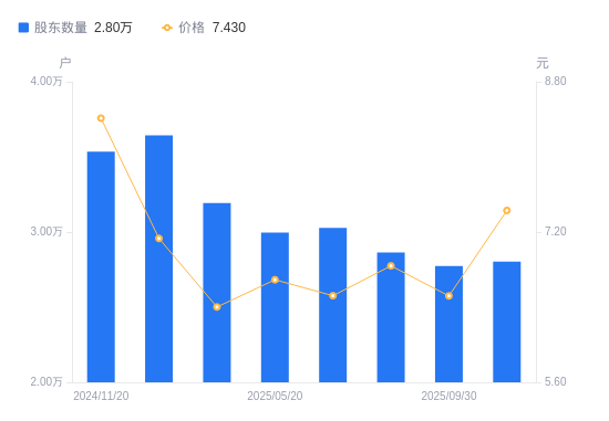 近一年(2024年11月20日至2025年11月10日),水发燃气A股股东户数从3.54万户,减低至2.8万户,降幅20.72%,区间股价下跌5.97%。