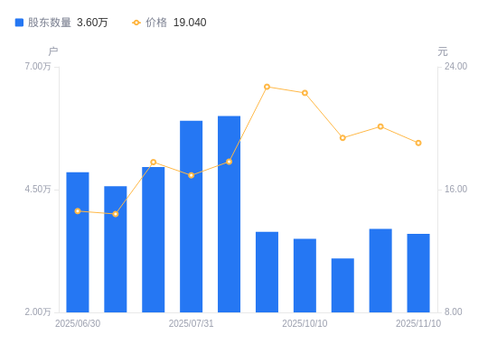 近一年(2024年11月20日至2025年11月10日),北化股份A股股东户数从4.28万户,减低至3.6万户,降幅15.98%,区间股价上涨61.63%。