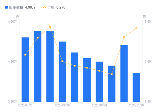 近一年(2024年11月29日至2025年11月10日),富瑞特装A股股东户数从4.55万户,减低至4.09万户,降幅10.28%,区间股价上涨11.61%。