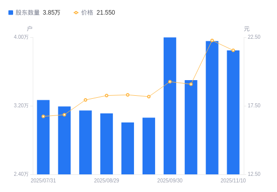 近一年(2024年11月20日至2025年11月10日),科瑞技术A股股东户数从3.84万户,增加至3.85万户,增幅0.25%,区间股价上涨27.36%。