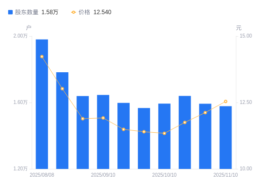 近一年(2024年11月29日至2025年11月10日),达嘉维康A股股东户数从1.57万户,增加至1.58万户,增幅0.39%,区间股价上涨5.75%。