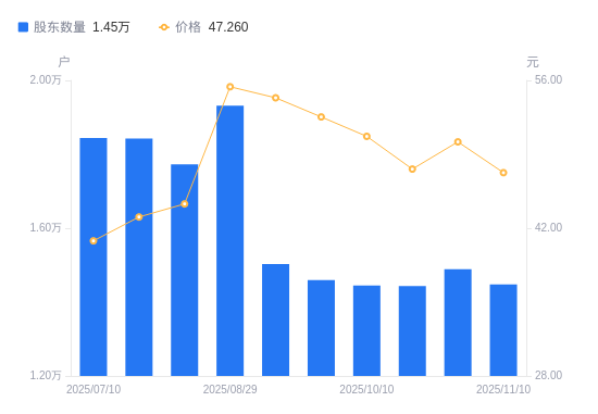 近一年(2024年11月20日至2025年11月10日),智立方A股股东户数从1.14万户,增加至1.45万户,增幅27.11%,区间股价上涨26.73%。