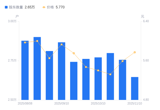 近一年(2024年11月20日至2025年11月10日),思美传媒A股股东户数从4.98万户,减低至2.65万户,降幅46.91%,区间股价上涨3.59%。