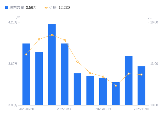 近一年(2024年11月20日至2025年11月10日),赛升药业A股股东户数从2.75万户,增加至3.56万户,增幅29.49%,区间股价上涨57.40%。
