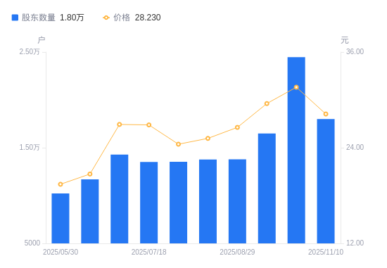 近一年(2024年11月20日至2025年11月10日),天山电子A股股东户数从1.23万户,增加至1.8万户,增幅46.84%,区间股价上涨95.51%。