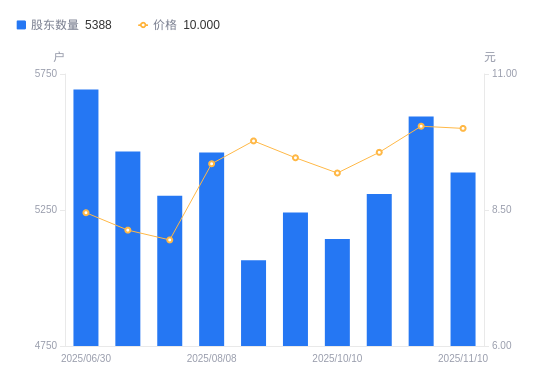 近一年(2024年11月29日至2025年11月10日),*ST荣控A股股东户数从8791户,减低至5388户,降幅38.71%,区间股价上涨11.11%。