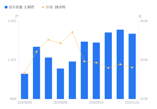 近一年(2024年11月20日至2025年11月10日),凯因科技A股股东户数从7435户,增加至1.3万户,增幅75.29%,区间股价上涨5.11%。