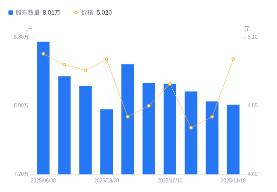 近一年(2024年12月20日至2025年11月10日),广安爱众A股股东户数从9.11万户,减低至8.01万户,降幅12.08%,区间股价下跌5.51%。