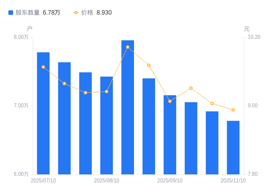 近一年(2024年11月30日至2025年11月10日),国星光电A股股东户数从5.54万户,增加至6.78万户,增幅22.36%,区间股价下跌2.30%。