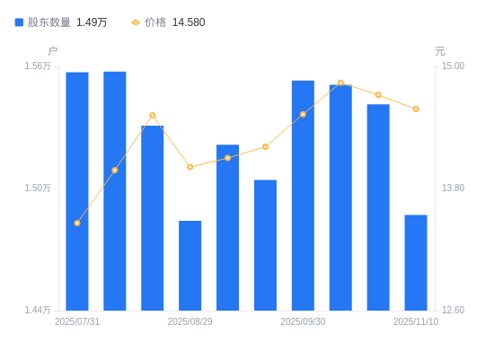 近一年(2024年12月10日至2025年11月10日),友讯达A股股东户数从1.69万户,减低至1.49万户,降幅11.84%,区间股价下跌3.57%。