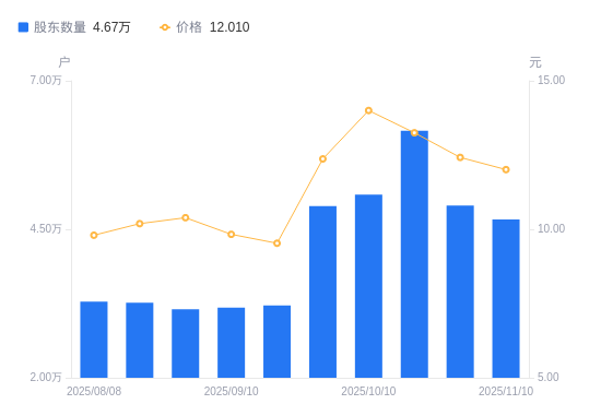 近一年(2024年12月20日至2025年11月10日),中山公用A股股东户数从3.79万户,增加至4.67万户,增幅23.25%,区间股价上涨38.52%。