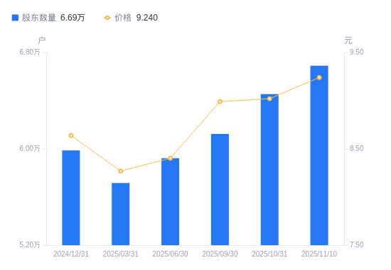 近一年(2024年12月31日至2025年10月31日),聚灿光电A股股东户数从5.99万户,增加至6.45万户,增幅7.81%,区间股价上涨4.59%。