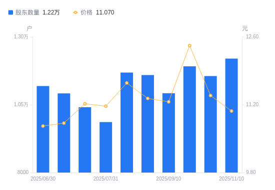 近一年(2024年12月31日至2025年11月10日),镇海股份A股股东户数从1.17万户,增加至1.22万户,增幅4.51%,区间股价上涨30.70%。
