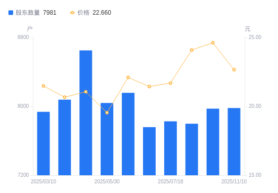 近一年(2024年12月31日至2025年11月10日),晶华微A股股东户数从8358户,减低至7981户,降幅4.51%,区间股价上涨6.70%。
