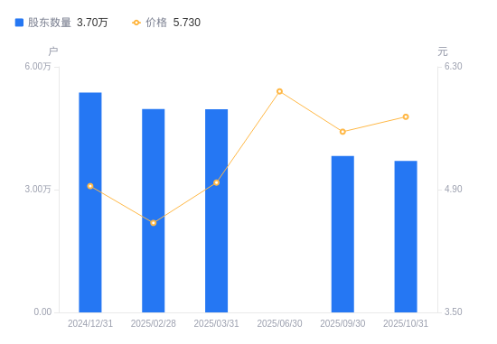 近一年(2024年12月31日至2025年10月31日),四川成渝A股股东户数从5.37万户,减低至3.7万户,降幅31.15%,区间股价上涨16.94%。