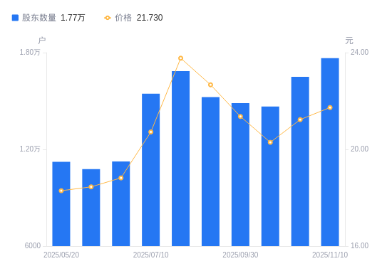 近一年(2024年11月20日至2025年11月10日),国安达A股股东户数从9996户,增加至1.77万户,增幅76.70%,区间股价上涨11.89%。