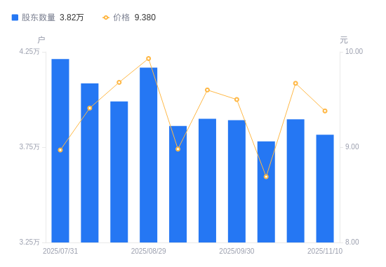 近一年(2024年11月14日至2025年11月10日),光韵达A股股东户数从5.38万户,减低至3.82万户,降幅29.09%,区间股价下跌7.22%。